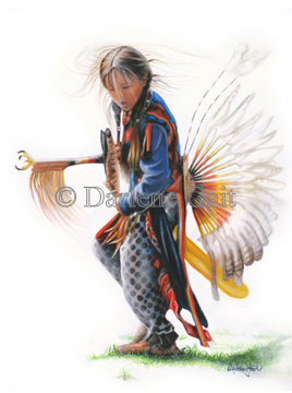 I remember this young child performing the Rooster Dance in the interior of BC. In his one hand you can see an eagle's claw on the end of a stick, which is a symbol for strength and great power, and he has a fancy bustle in back of him. He was a very talented dancer competing with a lot of adults, and I was very moved by his performance. I did this picture in memory of him. He would be teenager now as it has been a number of years since I created this picture.